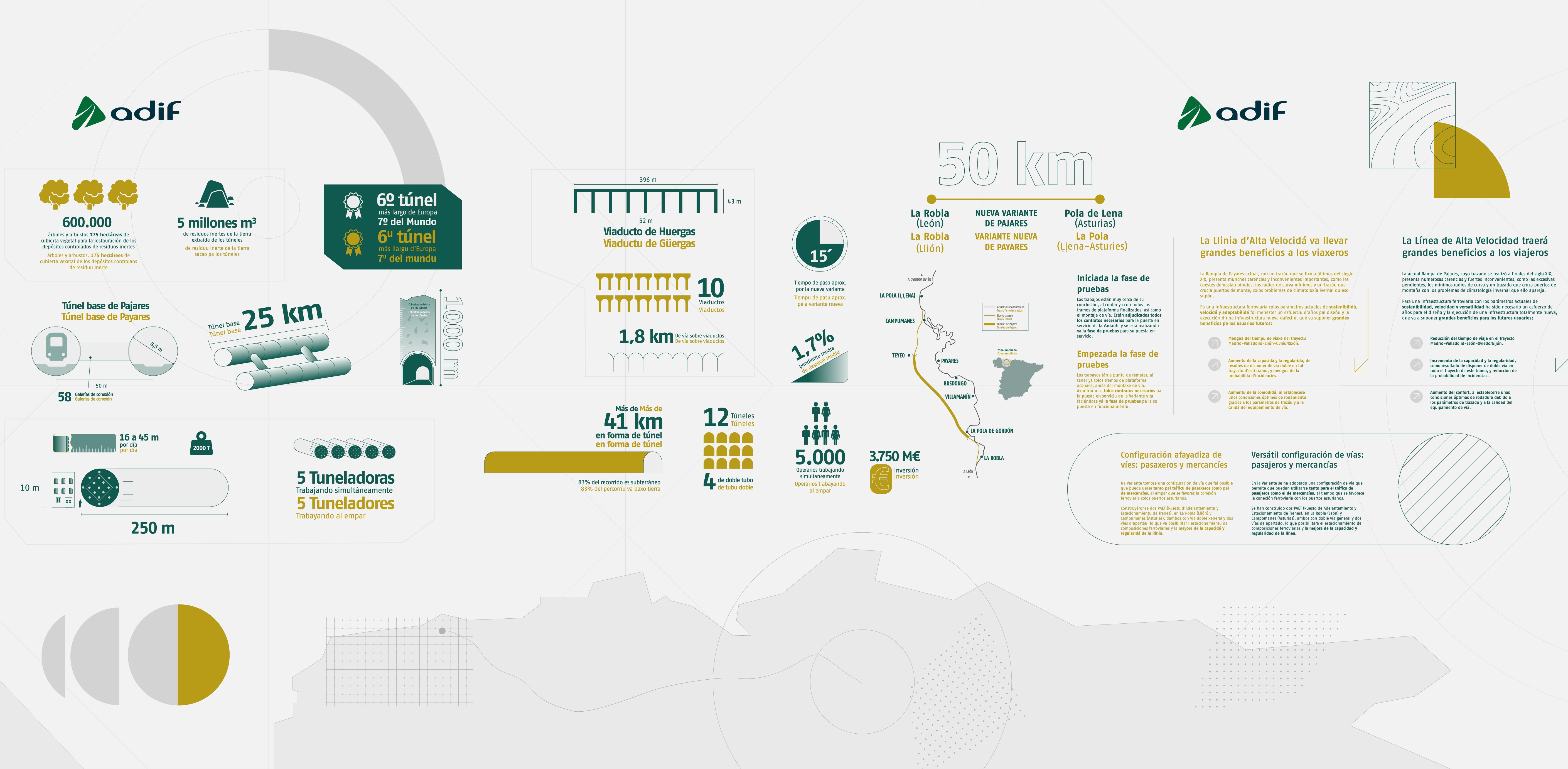 Die Variante de Pajares überbrückt den Pass unter dem Kantabrischen Gebirge und den großen Höhenunterschied zwischen der Provinz León und Asturien. Mit einer Investitionssumme von 4 Mrd. Euro stellt sie eine beispiellose technische und bauliche Herausforderung dar: 80 % ihrer Strecke - 50 km zwischen La Robla und Pola de Lena - verlaufen in Tunneln.